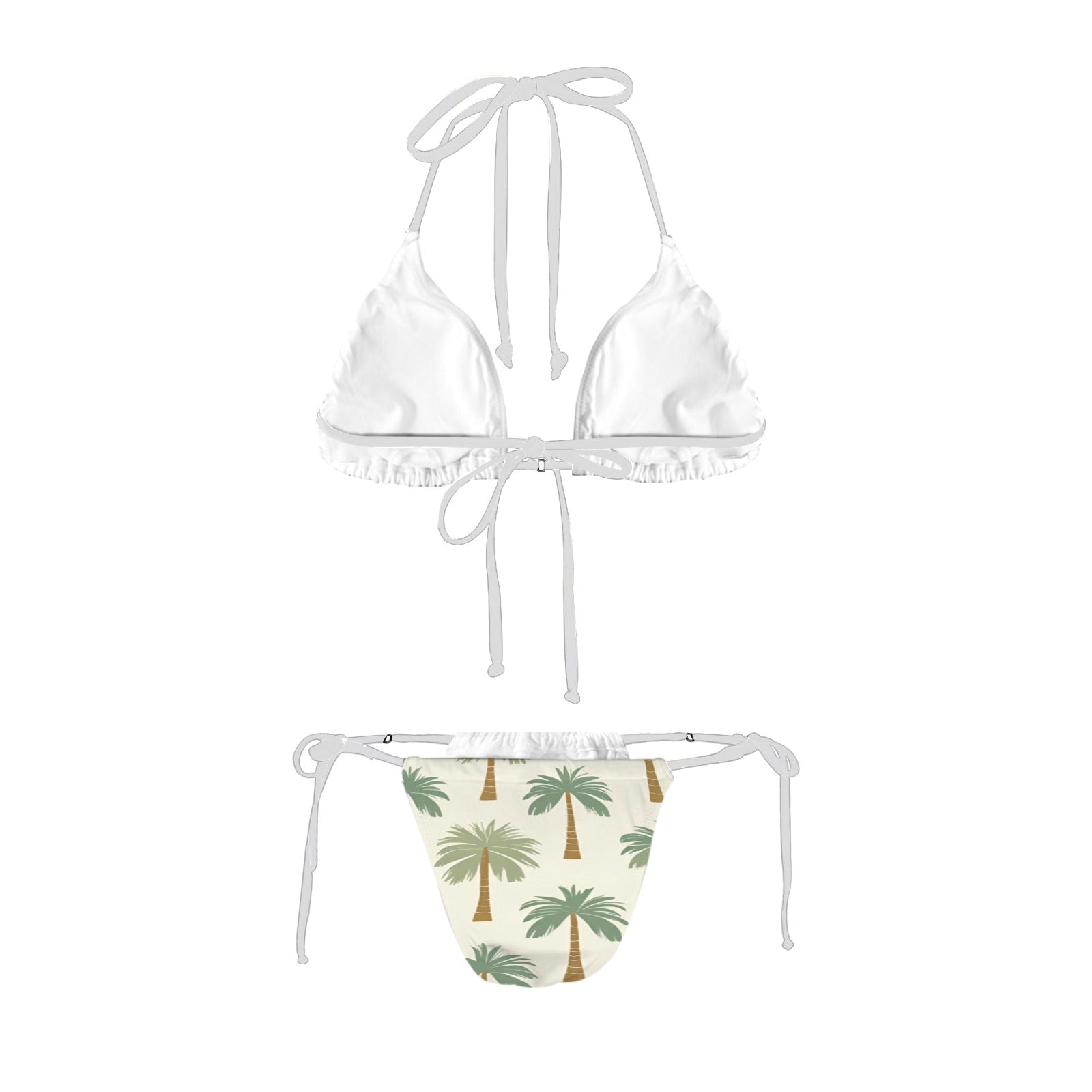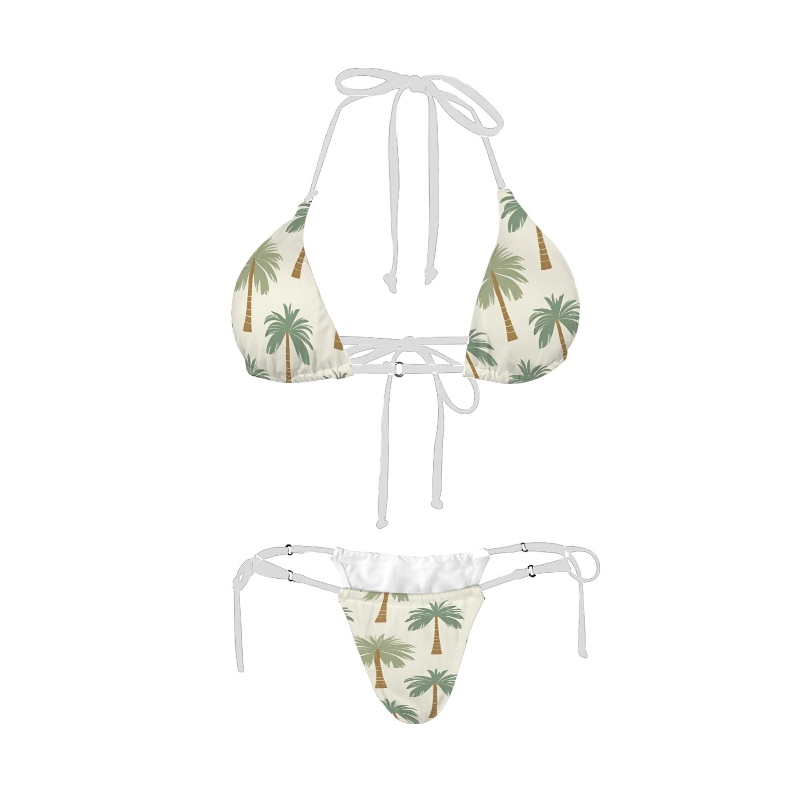 - This bikini set features a strappy halter top and a cheeky thong bottom, both designed for a flattering fit and comfort. The small metal ring accessories add a stylish touch, making it a perfect blend of fashion and function.