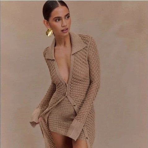 Il colore cachi, raffinato e moderno, avvolge la figura con una delicatezza naturale, mentre il design top corto intreccia eleganza e un tocco di audacia contemporanea. La lavorazione traforata, fine e preziosa, aggiunge un gioco di geometrie leggere che cattura la luce con discrezione.