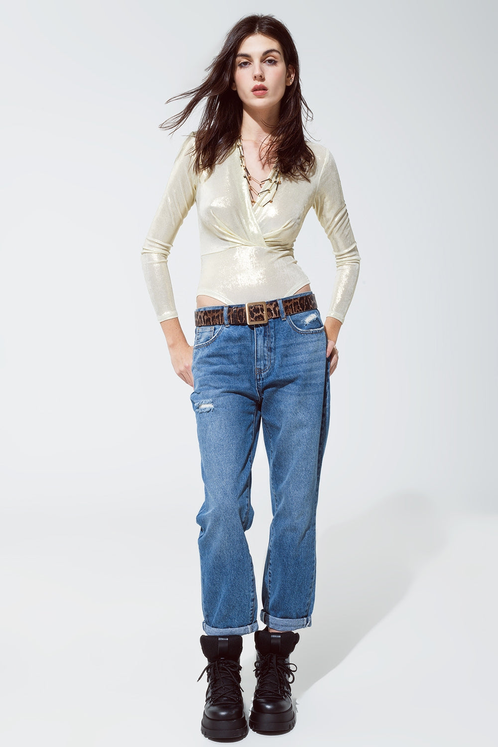 Scopri l'eleganza senza tempo di questo body con finitura metallizzata e dettagli drappeggiati in bianco perla, perfetto per chi cerca un capo sofisticato e di classe. Il design con scollo a V valorizza la silhouette, mentre il tessuto lurex dona un tocco brillante e raffinato, ideale per le occasioni speciali e le serate di festa.