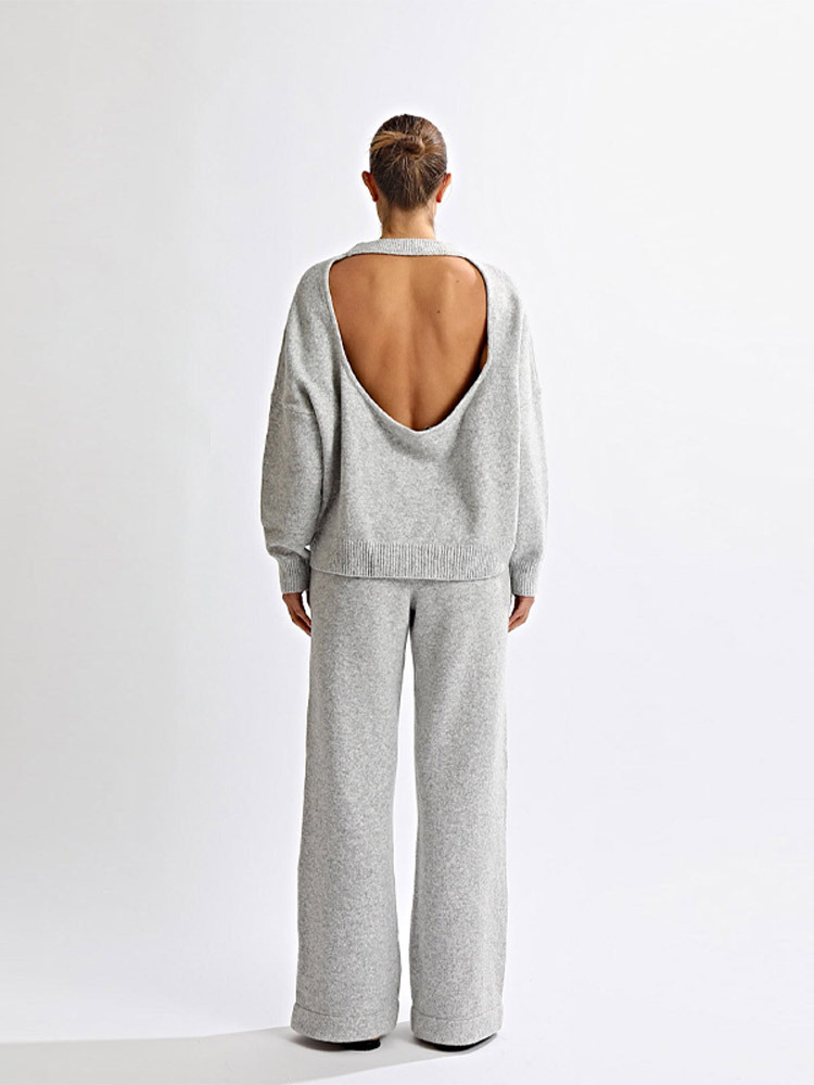 Completo con maglione lavorato a maglia, scollo tondo e schiena scoperta, maniche lunghe e pantaloni