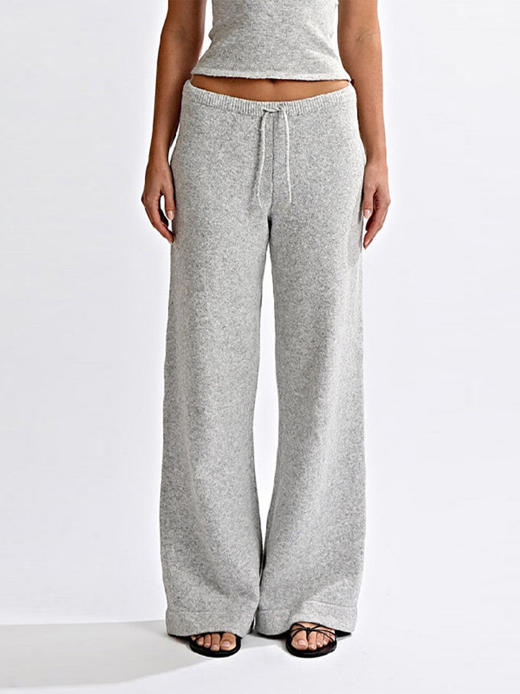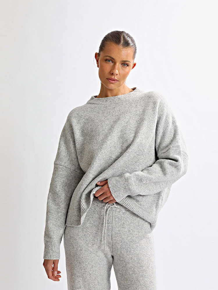 La maglia avvolge il corpo con delicatezza sul davanti, mentre sul retro apre una finestra di poesia: una curva morbida che accarezza la schiena e la rende protagonista. I pantaloni, caldi e confortevoli, scivolano con grazia, regalando una silhouette rilassata e chic.