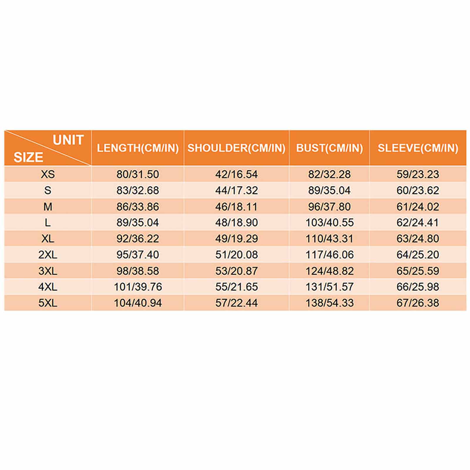 Available in XS, S, M, L, XL, 2XL, 3XL, 4XL, 5XL. Please refer to the size chart below to select the appropriate size.