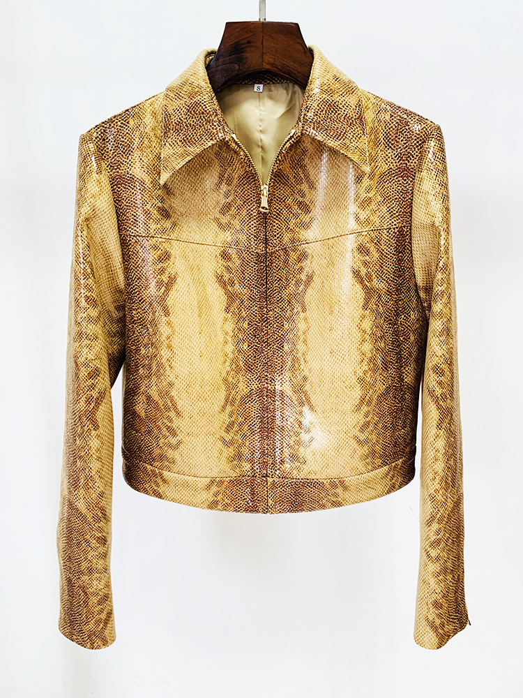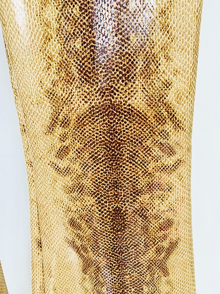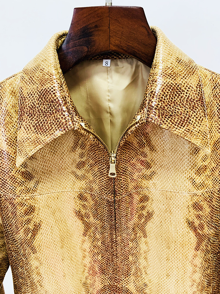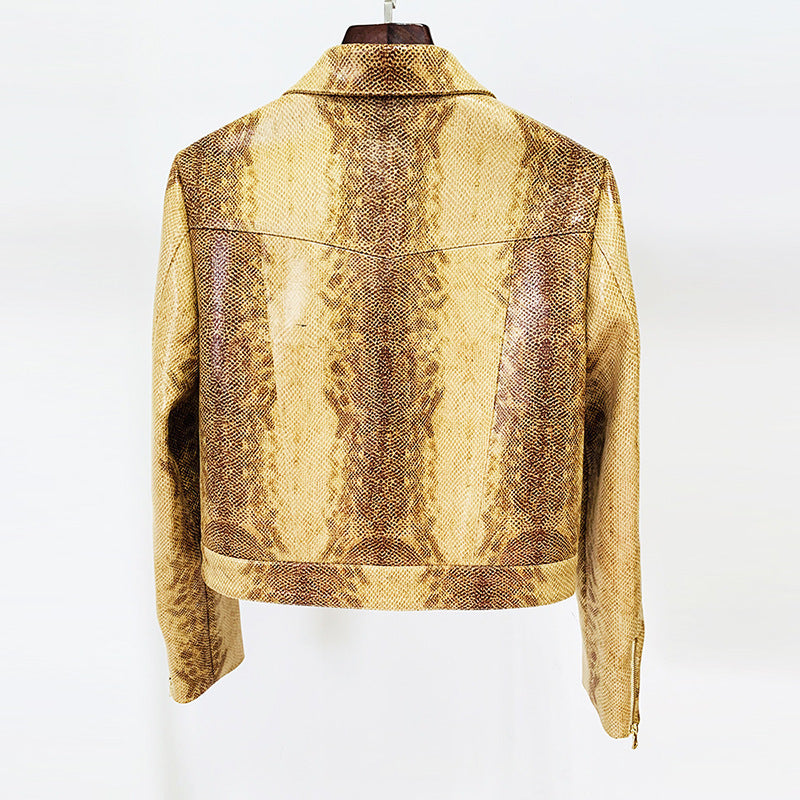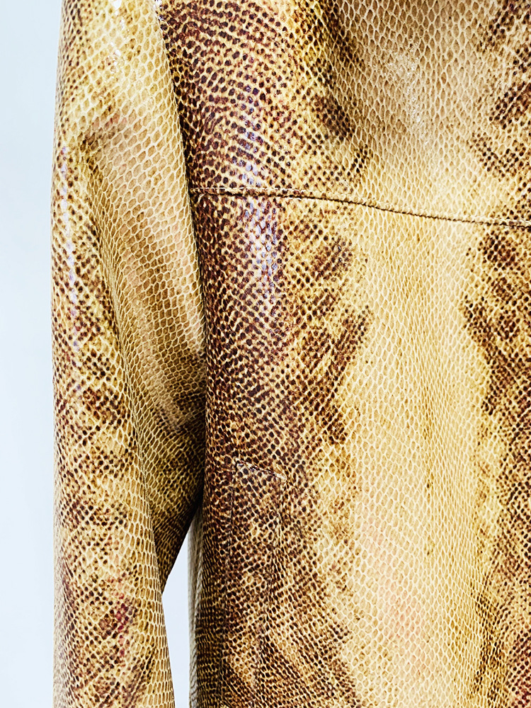 Giacca in pelle con stampa serpente e pantaloni svasati