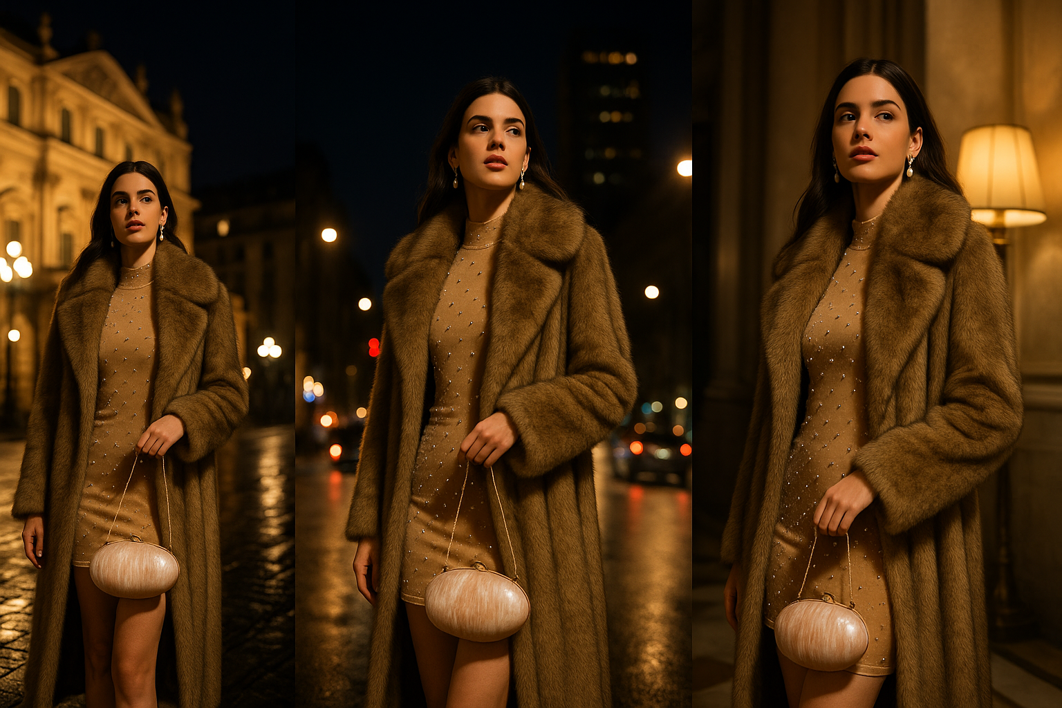 Un outfit che sussurra eleganza, non la grida. Il mini-dress nude punteggiato di perle sembra disegnato dalla luce, mentre la pelliccia calda e il tocco madreperla della clutch aggiungono quella morbida opulenza che ricorda i film d’altri tempi. È la combinazione perfetta tra dolcezza e potere: una donna che entra in scena con grazia, ma lascia dietro di sé un’eco dorata.