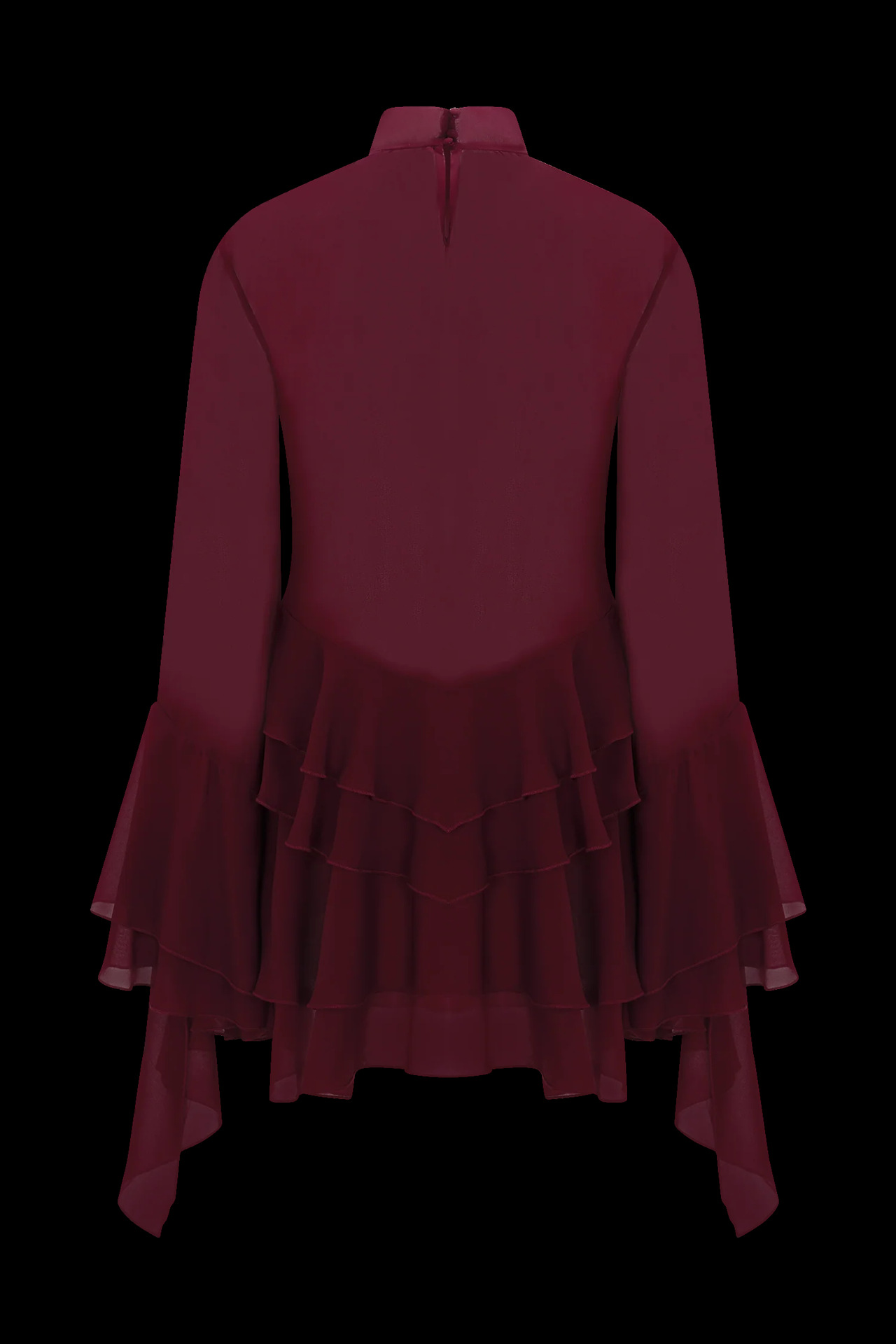 Questo modello in rosso scuro, intenso e magnetico, è pensato per chi ama unire essenzialità e personalità in un solo gesto. La gonna a tubino corta, a vita alta, modella le linee con eleganza moderna, mentre i dettagli di patchwork, nastro e collage creano un gioco visivo che rende ogni movimento più interessante, più vivo, più tuo.